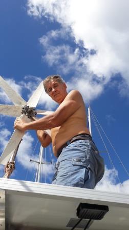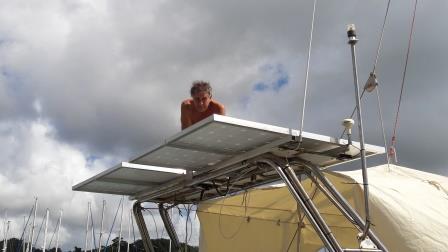 Pendant l'hivernage, le dessalinisateur a été passé de 380 en 12V, le GPS Furuno GP32 dont l'écran était tout nuageux a été changé et l'hydraulique de la barre à roue a été révisée. Il nous reste maintenant à remplacer nos deux panneaux solaires de 75W par 4 panneaux modernes de 150W chacun ... Avec 600W solaires plus l'éolienne, nous espérons retrouver l'autonomie énergétique perdue avec la suppression du générateur. Nous avons un tout petit