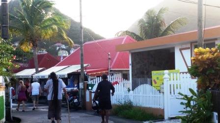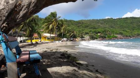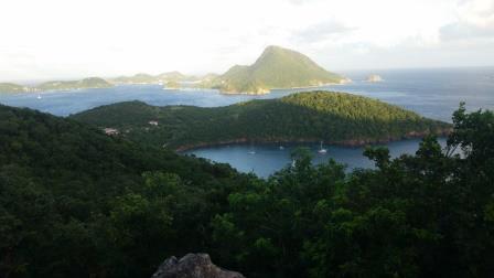 Le jour levé, nous avons coordonné notre manoeuvre entre la barre, le moteur, le guindeau, le petit bout de toile prêt à être déroulé ...et tout s'est parfaitement passé. Nous avons quitté ce (joli) piège pour rejoindre l'anse Fideling à Terre-de-Bas. Une baie superbe et calme où nous profiterons de beaux fonds coralliens (rive Nord en allant jusqu'à la pointe Est). Balade -une sacrée grimpette - avant le coucher du soleil jusqu'au belvédère au-dessus de l'anse Fideling. Panorama exceptionnel sur l'ensemble de l'archipel des Saintes. On aperçoit la RozAvel (celui sur la droite) quasiment seule dans l'anse Fideling de Terre-de-Bas. Au fond : Terre-de-Haut. Maisons très colorées La plage de Grand Anse à Terre-de-Bas