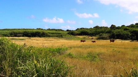Arrêt déjeuner à Capesterre, village prolongé par une belle plage de sable blanc et cocotiers. Paysages de cannes et de grandes étendues vertes avec des vaches qui paissent tranquillement...Etonnant sous ces latitudes.