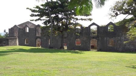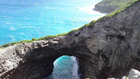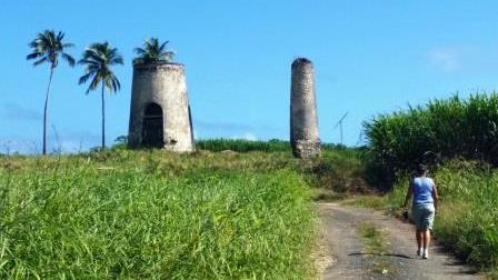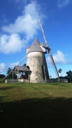 Arche au-dessus des flots : Gueule Grand gouffre. Zut on rate la chapelle Ste Thérèse. Juste avant Tacy nous partons sur un chemin de terre et découvrons un premier moulin encadré de trois immenses cocotiers : moulin Desruisseaux.