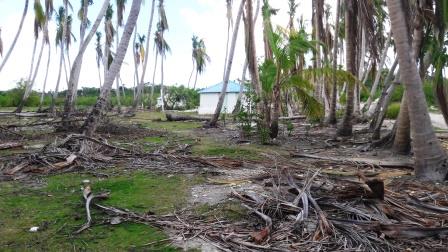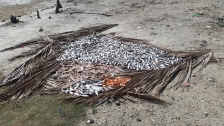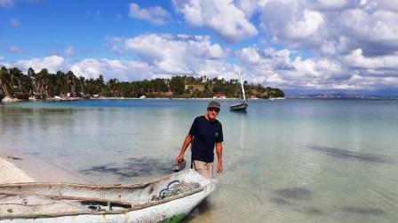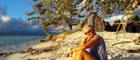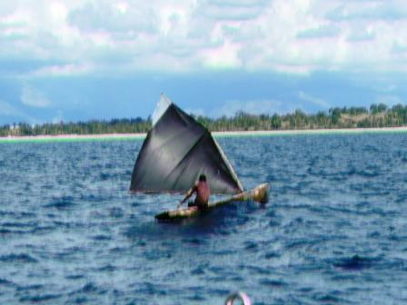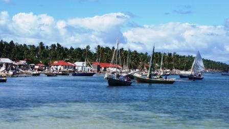 Lundi 23 janvier après le déjeuner, nous allons au moteur mouiller à l’île Permontois, un simple banc de sable avec quelques arbres, couvert de huttes en branchages où vivent une quarantaine d’habitants-pêcheurs.