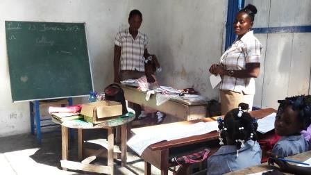 d’école et deux institutrices sont là. Cahiers et leçons au tableau sont en