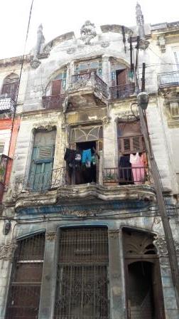 Nous resterons trois jours à La Havane, notre avion de Aviaçon de Cuba ayant… deux jours de retard. Notre logement est à Habana Centro, à l’Ouest du « centre historique » - La Habana Vieja – facilement accessible à pied. Nous ferons néanmoins des kilomètres à arpenter dans tous les sens le centre patrimonial… Une architecture éclectique et superbe ! Du baroque colonial-espagnolisant, de l’art déco, de l’art nouveau… Des bâtiments magnifiquement restaurés et d’autres…en attente de l’être. Quelques-uns font vraiment penser à du Gaudi. La tête en l’air, le regard qui s’égare dans des patios, on se régale. Certains « palais » délabrés sont visiblement occupés par des familles qui y « campent » avec les moyens du bord. Je rentre dans l’un d’eux particulièrement « destroyed » (plusieurs balcons de sa belle façade pendouillent). Suite à mes questions la femme m’explique : « Ici l’organisme chargé de la rénovation – Officina del Historiador – n’est jamais venu. On nous laisse tomber ».