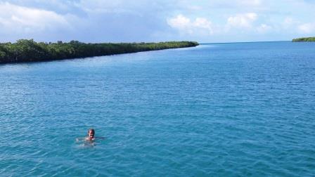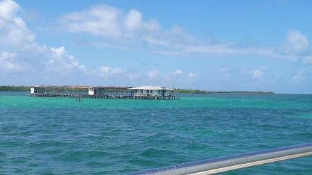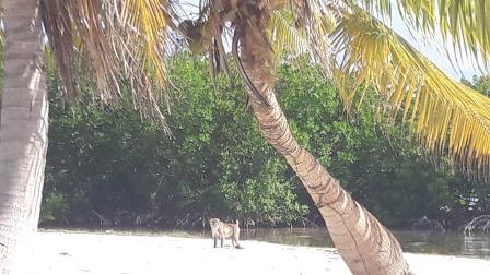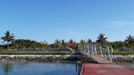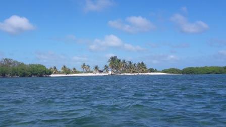 Lundi 15 mai : après les dernières baignades sur ce fond turquoise, nous levons l’ancre à la voile pour avancer au milieu des cayos dont la description est paradisiaque. La pêche est fructueuse aujourd’hui : Laurence remonte une -carangue gros yeux- qui affiche 4,6 kg au peson. Le vent faiblit et c’est au moteur que nous arrivons au Cayo Cantiles : mouillage devant la station biologique après avoir franchi une passe délicate dans les récifs. Comme toujours ici, il manque la moitié des bouées ou balises indiquées sur la carte. Les fonds sont noirâtres et herbeux, la côte est en corail gris peu engageant.