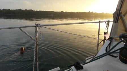 moi dans les eaux parfaitement calmes de ce mouillage, nous nous dirigeons vers