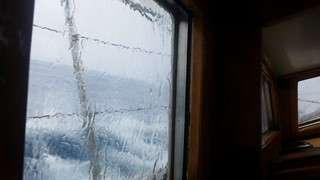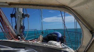 Rauscher. Jeudi 22 février, les voiles sont levées dès la passe franchie. Le bateau marche bien. La barre noire de nuages à l’horizon n’était pas un simple grain … Christian, un peu flemmard, avait gardé toute la toile. Durant plus de trois heures, nous avons subi de très fortes rafales et avons été bien secoués!